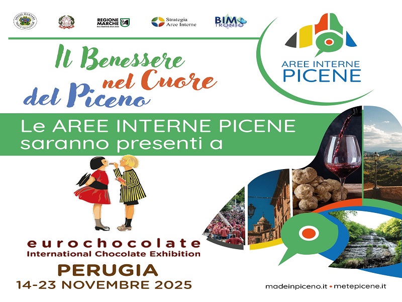 Il progetto di promozione delle Aree Interne del Piceno — un territorio costituito da ben 17 Comuni, che si sviluppano tra la fascia collinare e quella montana — parte ufficialmente da Eurochocolate, la grande festa del cioccolato che si svolge a Perugia dal 14 al 23 novembre prossimo e che attrae, nel centro storico del capoluogo umbro, circa un milione di visitatori provenienti da tutta Italia e da diversi Paesi europei.
